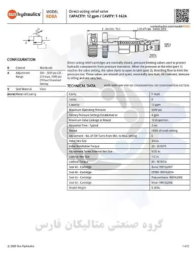 مشخصات تکنیکی شیر کارتریج sun hydraulic مدل RDBA-KAV