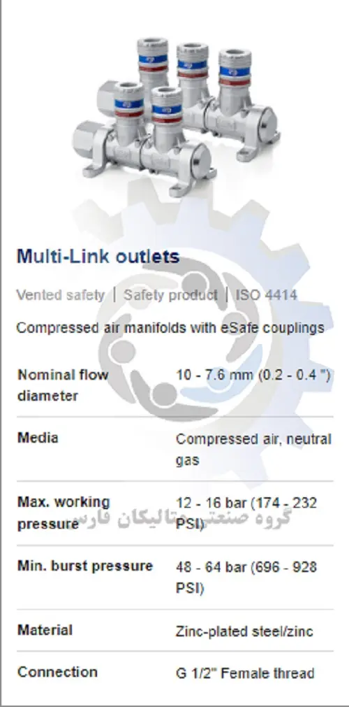 پریزهای چند لینکی محصول ایمنی تهویه ای ISO 4414 منیفولدهای هوای فشرده با کوپلینگ eSafe فضای کاری ایمن و سازمان یافته با خروجی های چندگانه هوای فشرده با جریان نامحدود - طراحی شده توسط eSafe کوپلینگ های اتصال سریع یکپارچه Multi-Link در واحدهای 1 تا 5 خروجی عرضه می شوند. واحدها همچنین می توانند به راحتی برای ایجاد نقاط دسترسی بیشتر به هم متصل شوند. ایده آل برای شلوغ کردن مناطق کار موجود یا ایجاد ایستگاه های کاری انعطاف پذیر جدید. کوپلینگهای یکپارچه انعطافپذیری و عملکرد بالا را فراهم میکنند، طراحی اجازه میدهد تا تعداد زیادی خروجی بدون محدود کردن جریان با اتصالات T، خم شدن یا زانویی ایجاد شود. در ترکیب با شیلنگ پلی اورتان با کیفیت بالا، به یک سیستم توزیع هوا با عملکرد بالا و انعطاف پذیر تبدیل می شود.